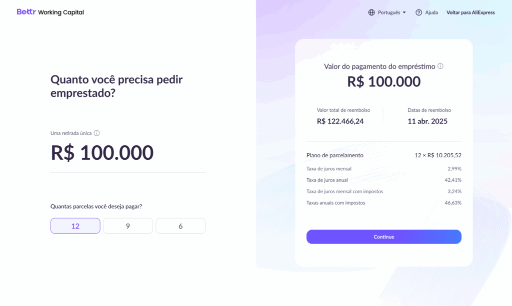 ผู้ขายสามารถยื่นขอ Bettr Working Capital ที่ยืดหยุ่นได้ผ่านส่วนบริการการเงินในศูนย์ผู้ขายของ AliExpress โดยมีขั้นตอนการสมัครดิจิทัลที่ง่ายดาย พร้อมการโต้ตอบที่เป็นมิตรบนหน้าเพจ ติดตามการอนุมัติแบบเรียลไทม์ การจ่ายเงินทุนอย่างรวดเร็ว และบริการลูกค้าที่ตอบสนองได้ทันที Bettr Working Capital มีวงเงินกู้เริ่มต้นเพียง 1,000 รีอัลบราซิล พร้อมอัตราดอกเบี้ยที่แข่งขันได้ ตัวเลือกการผ่อนชำระที่ยืดหยุ่น และไม่ต้องการหลักประกัน ซึ่งได้รับการออกแบบมาเพื่อลดต้นทุนการเงินและบรรเทาภาระทางการเงินของผู้กู้ในธุรกิจขนาดกลางและขนาดย่อม (SME)